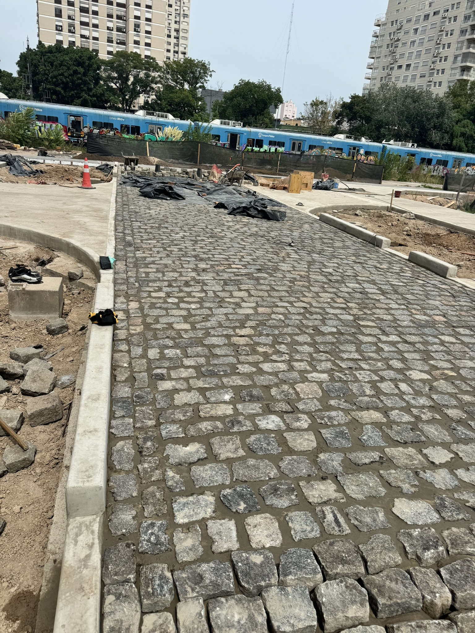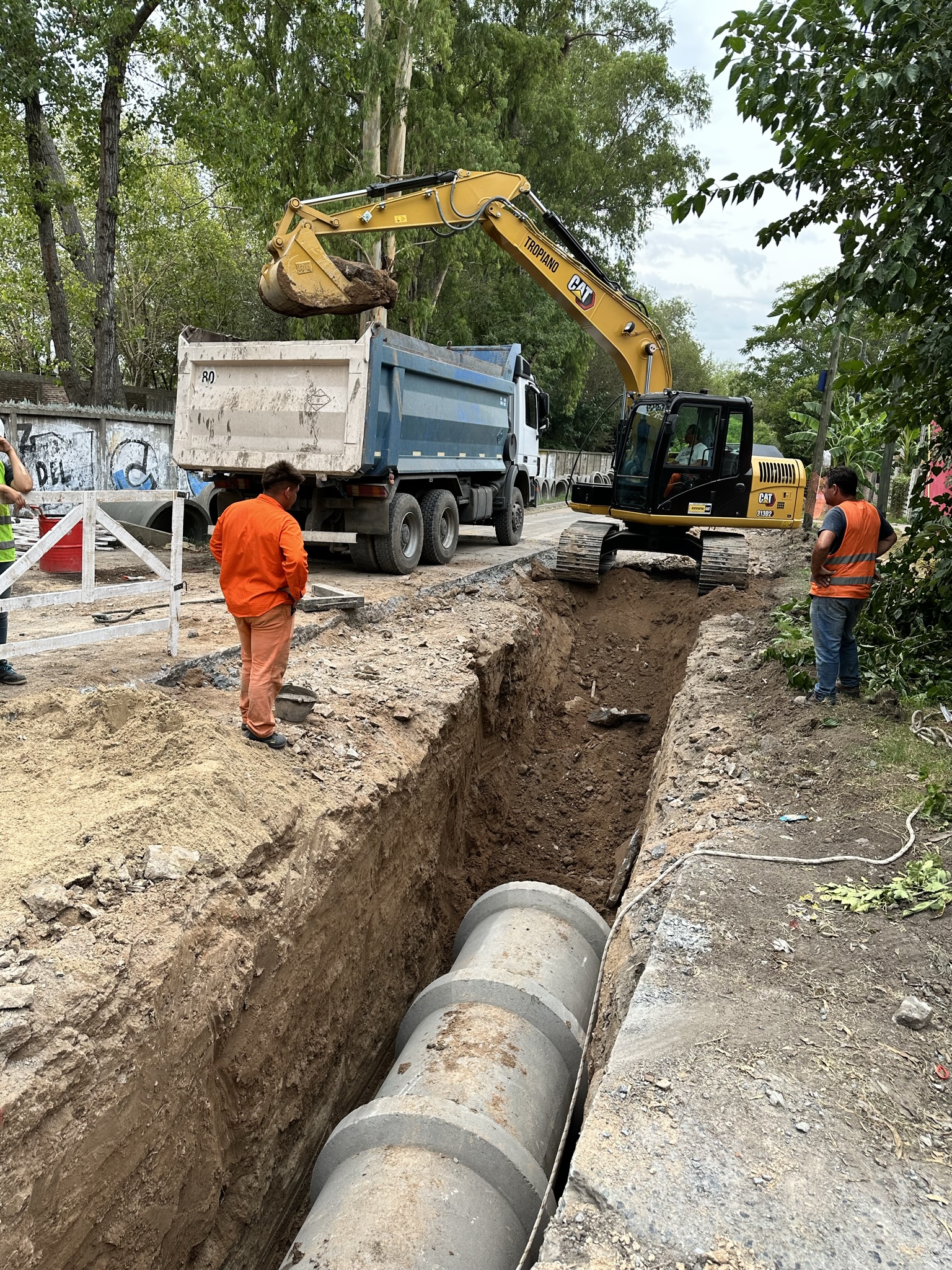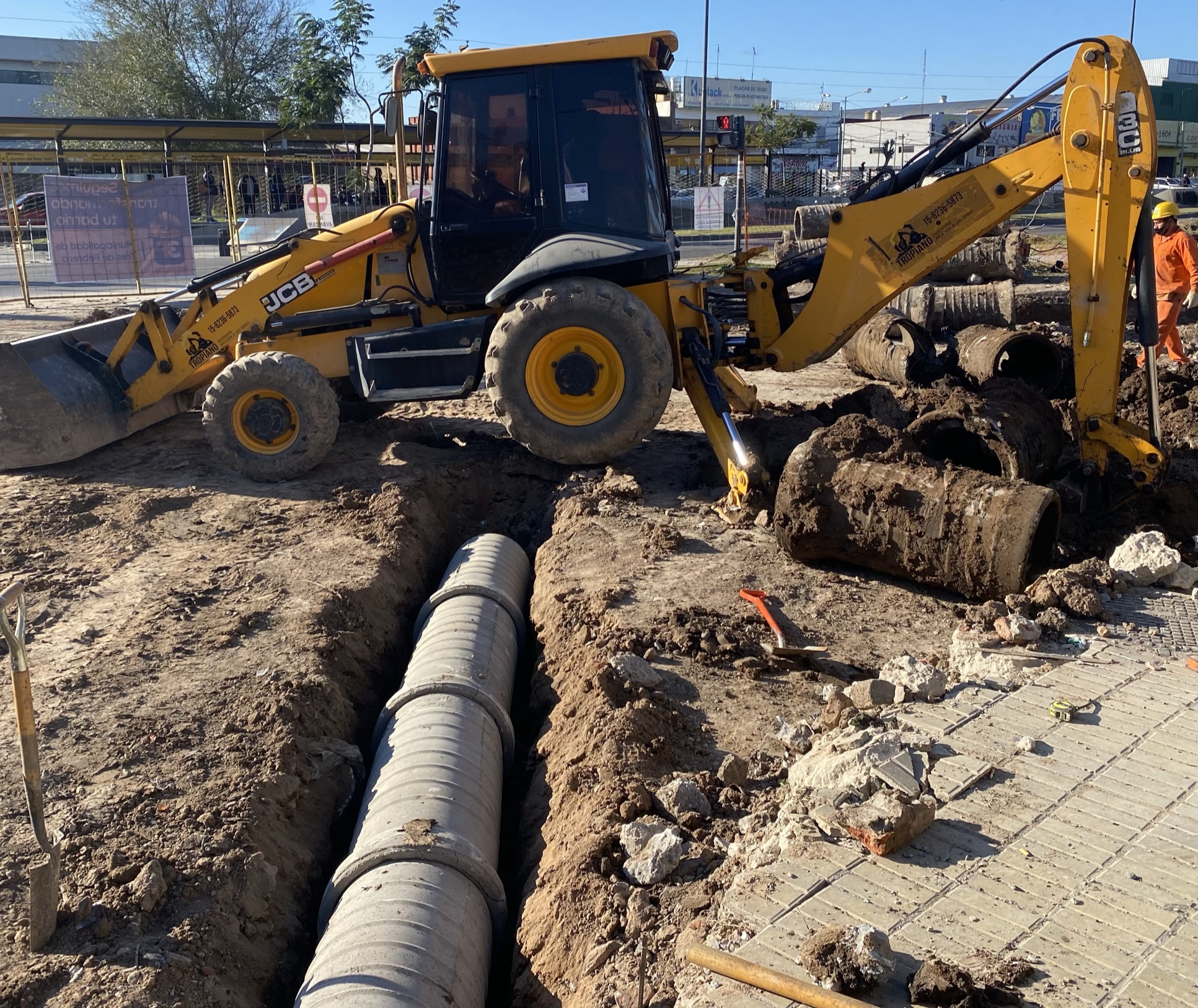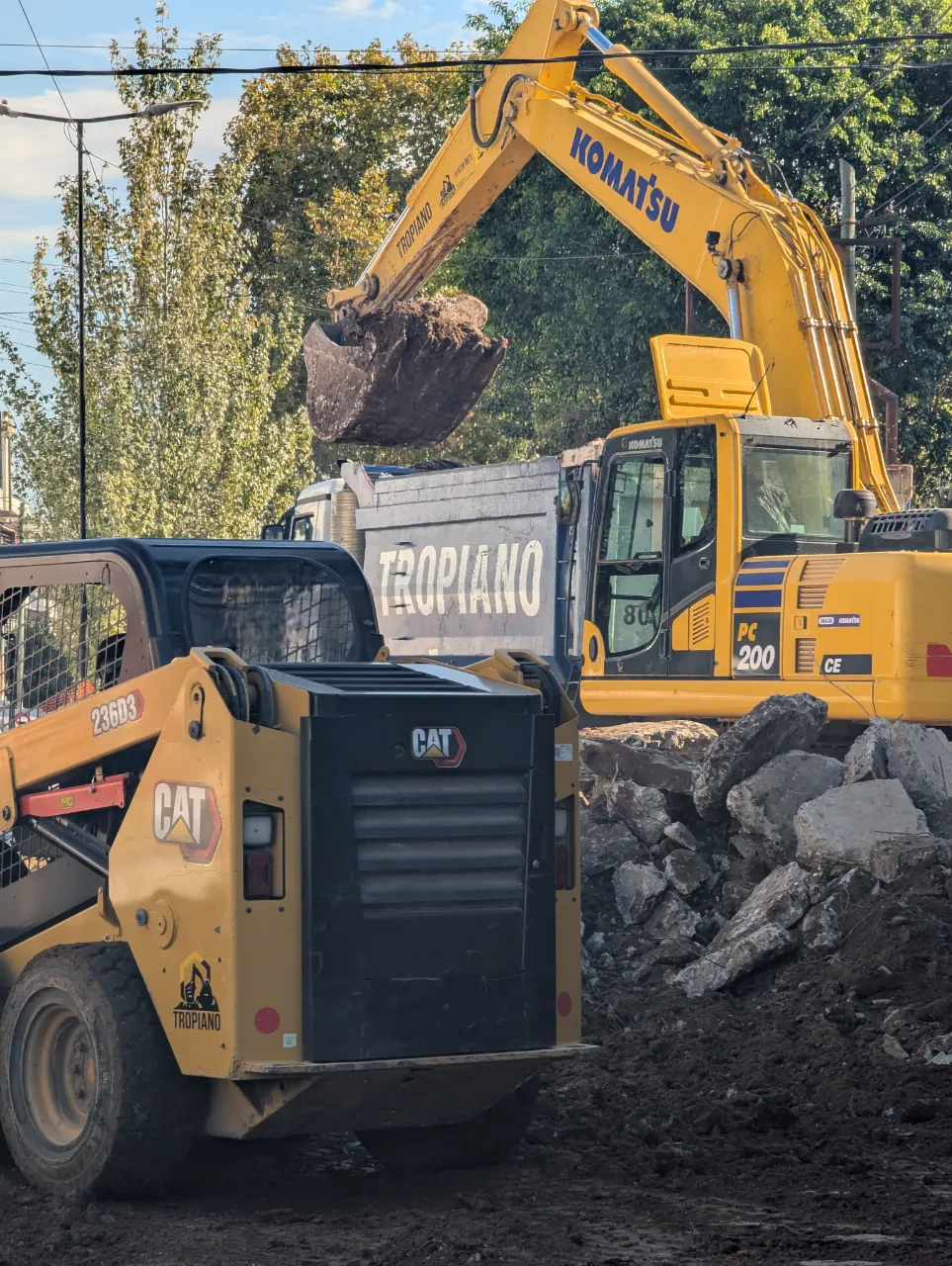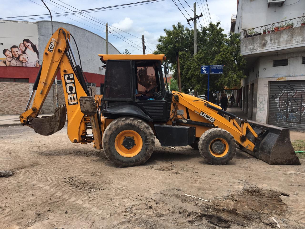 Excavadora engomada trabajando en la renovación de calle.